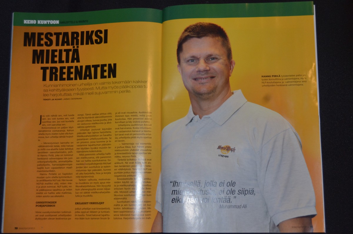Tässä kahden aukeaman artikkelissa Hannu kertoo mm. mielikuvaharjoittelusta sekä muista urheilun henkiseen valmennukseen liittyvitä asioista.
